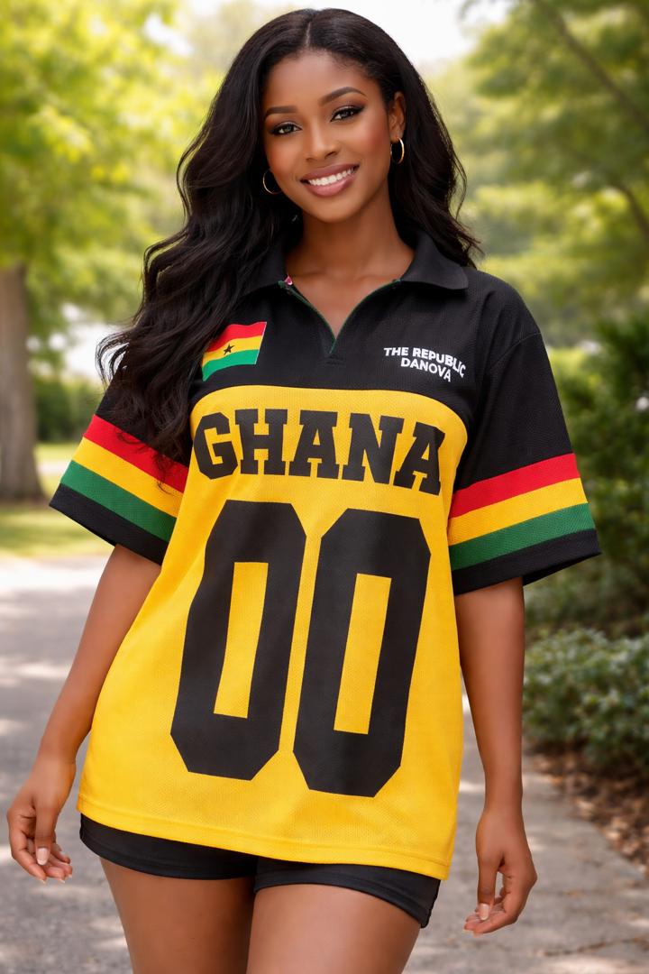 - Show your pride in bold style with this Ghana-inspired jersey. Featuring vibrant national colors on the sleeves, a striking “GHANA 69” front print, and a comfortable athletic fit, this piece blends culture and sport effortlessly. Perfect for casual wear, events, or representing Ghana wherever you go.